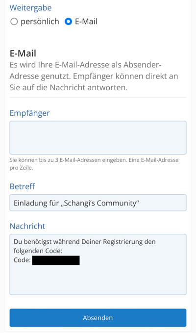 Der Code kann entweder persönlich - z.B. per WhatsApp von euch selbst übergeben werden, oder per E-Mail.